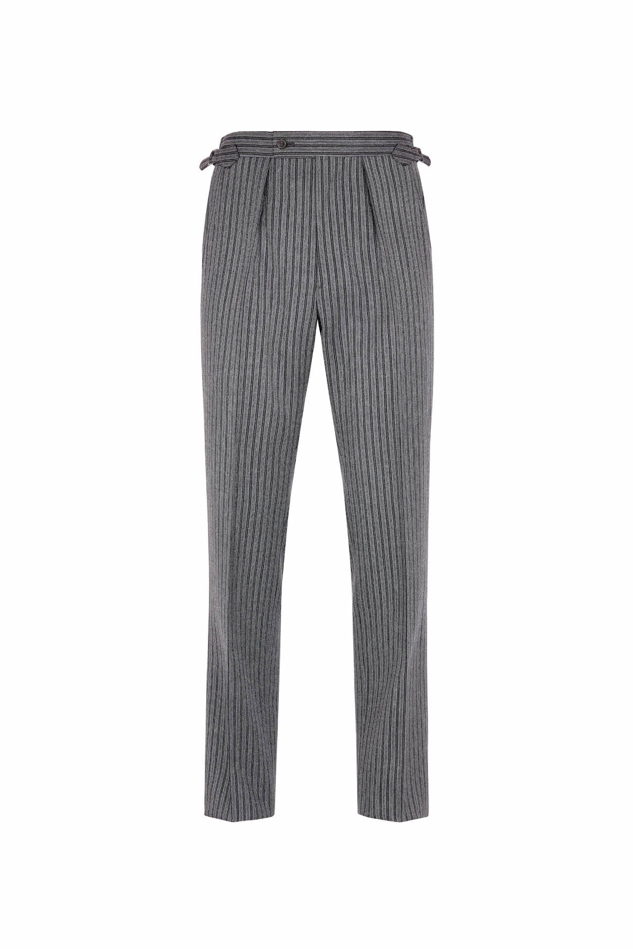 An elegant addition to your morning wear, these grey wool ‘cashmere stripe’ trousers are designed to pair with a classic black morning coat and linen or wool vest. With side adjusters and internal brace buttons for a streamlined look that elongates the leg.