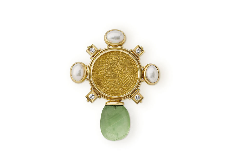Explore the elegance of our striking 18ct yellow gold pin, showcasing a magnificent gold ‘Ryal’ coin from the reign of Edward IV (1461 – 1470 AD). Adorned with square plinths set with exquisite round, brilliant-cut diamonds at each diagonal, this opulent piece features oval mabé cultured pearls along the top and sides, complemented by a substantial fluorite bead at the base. The Edward IV Gold Ryal, minted during his 1st Reign between 1461-1470 AD, replaced the debased noble of Henry IV, featuring a design akin to the noble with an added rose motif. With a value of ten shillings, this historical coin embodies regal opulence and timeless allure.